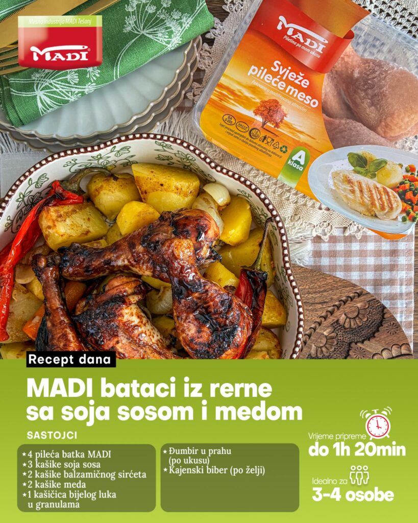 90 min Priprema Srednjezahtjevno 3-4 osobe Sastojci: 4 pileća batka Madi3 kašike soja sosa2 kašike balzamičnog sirćeta2 kašike meda1 kašičica bijelog luka u granulamađumbir u prahu (po ukusu)kajenski biber (po...