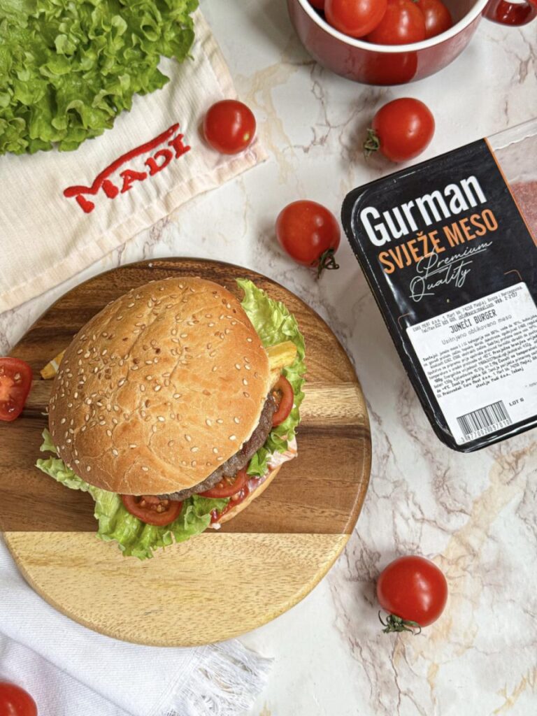 Na zagrijano ulje staviti Gurman juneći burger, pa peći na laganoj temperaturi da zadrži sočnost, puni okus i vrhunski kvalitet. U međuvremenu pripremiti i pomfrit.