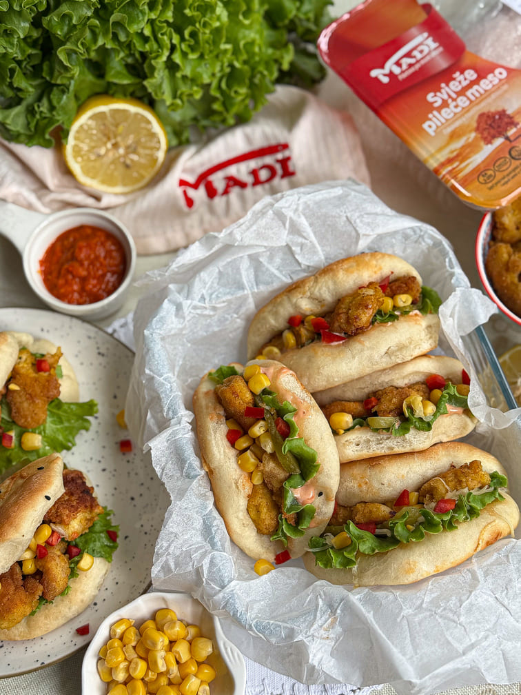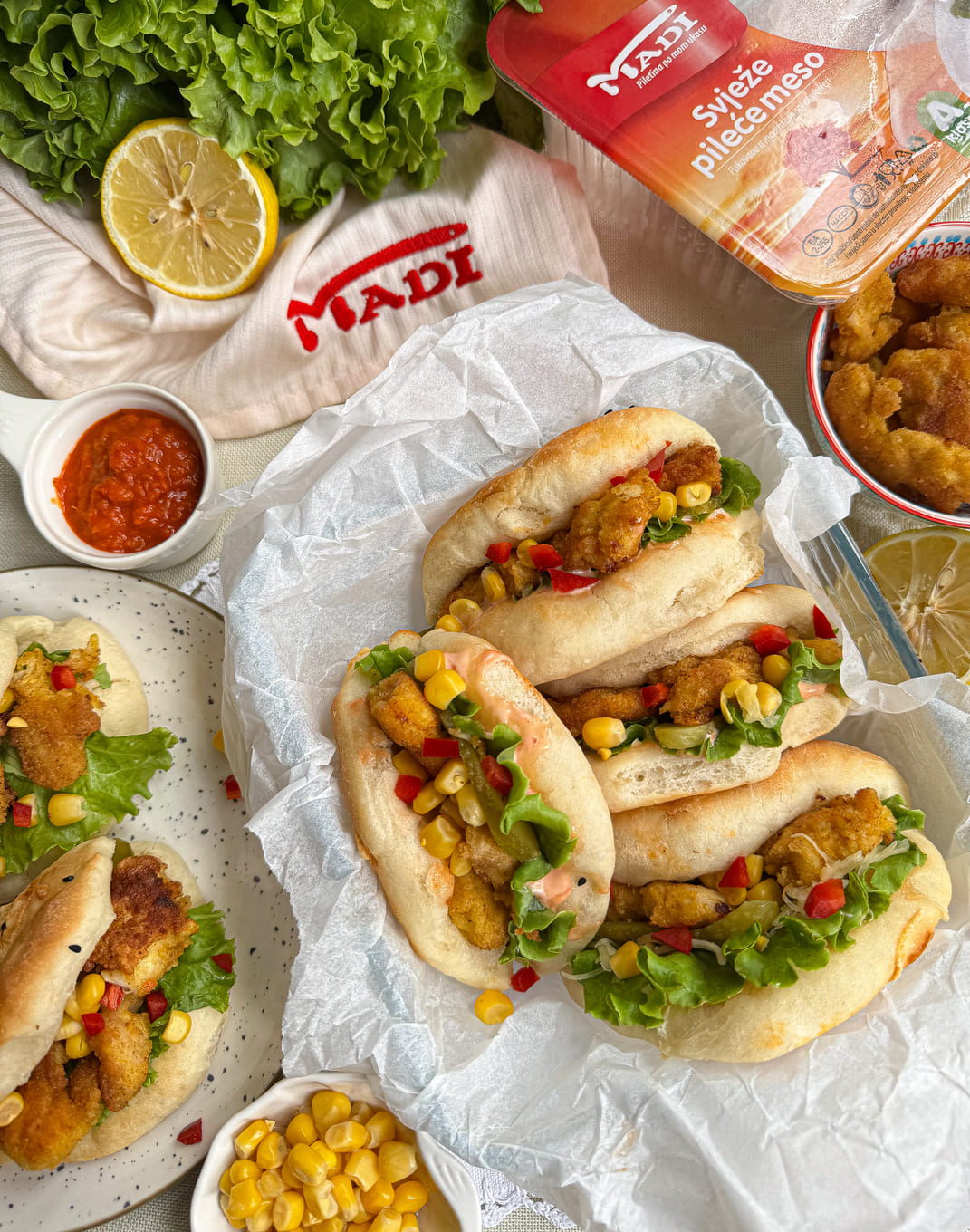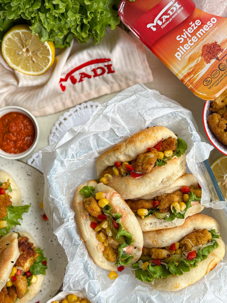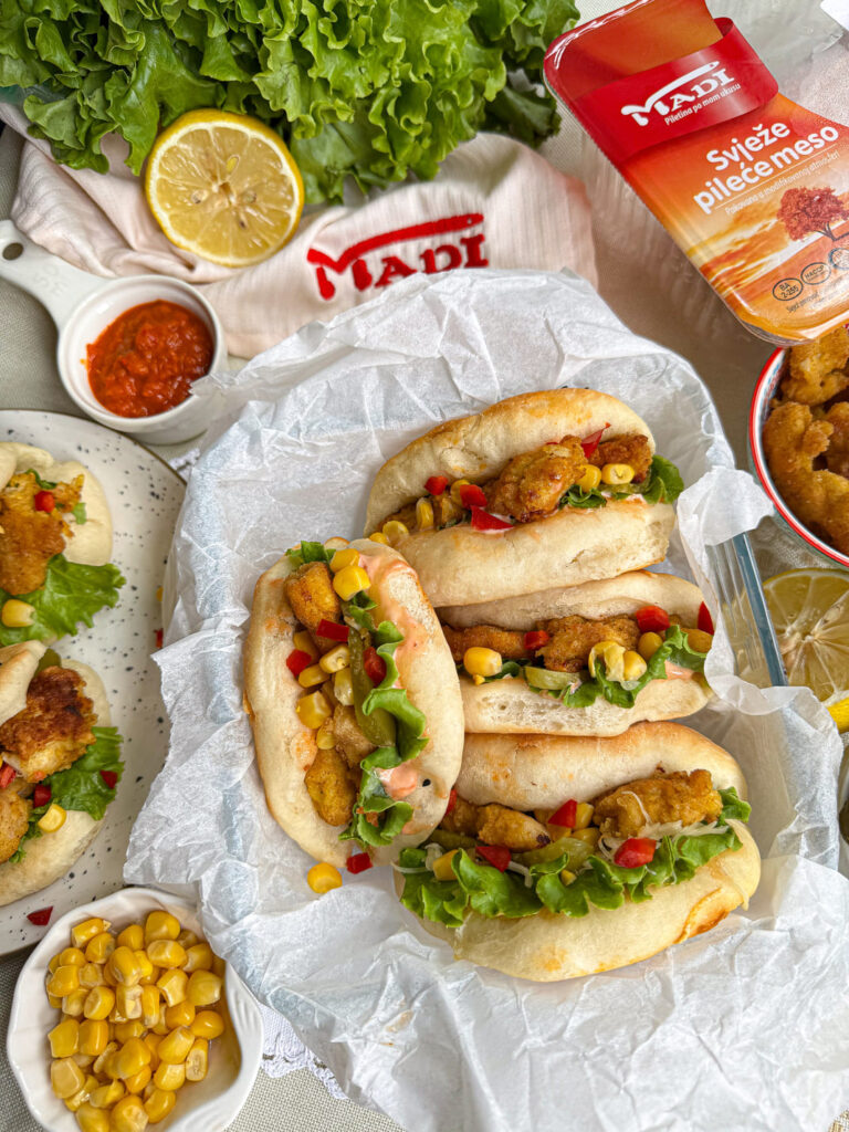 Zatim sendviče puniti sa namazima po želji, zelenom salatom, pohovanom MADI piletinom i dodati po želji kukuruza i sjeckane crvene paprike. Uživati u odličnom okusu.