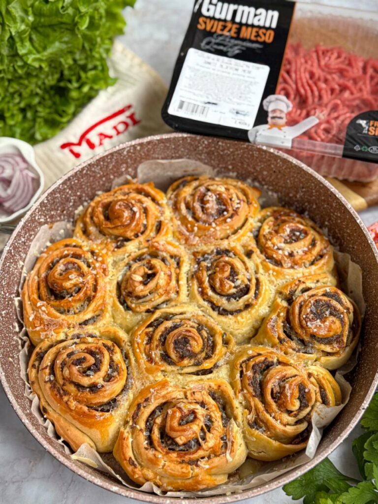 Tijesto razvaljati u obliku većeg pravougaonika zatim staviti meso ravnomjerno na čitavu površinu i naribanog topljenog sira i sjeći na trakice uzduž. Urolati rolnice i redati u pleh u koji smo prethodno stavili papir za pečenje.