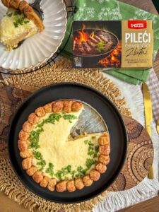 Ćevape kratko prepržite na zagrijanoj tavi bez dodatne masnoće, tek da dobiju rumenu koricu. Ostavite da se malo ohlade. Okrugli pleh (22 cm, sa skidajućim obručem) premažite uljem. Rernu zagrijte na 220°C.