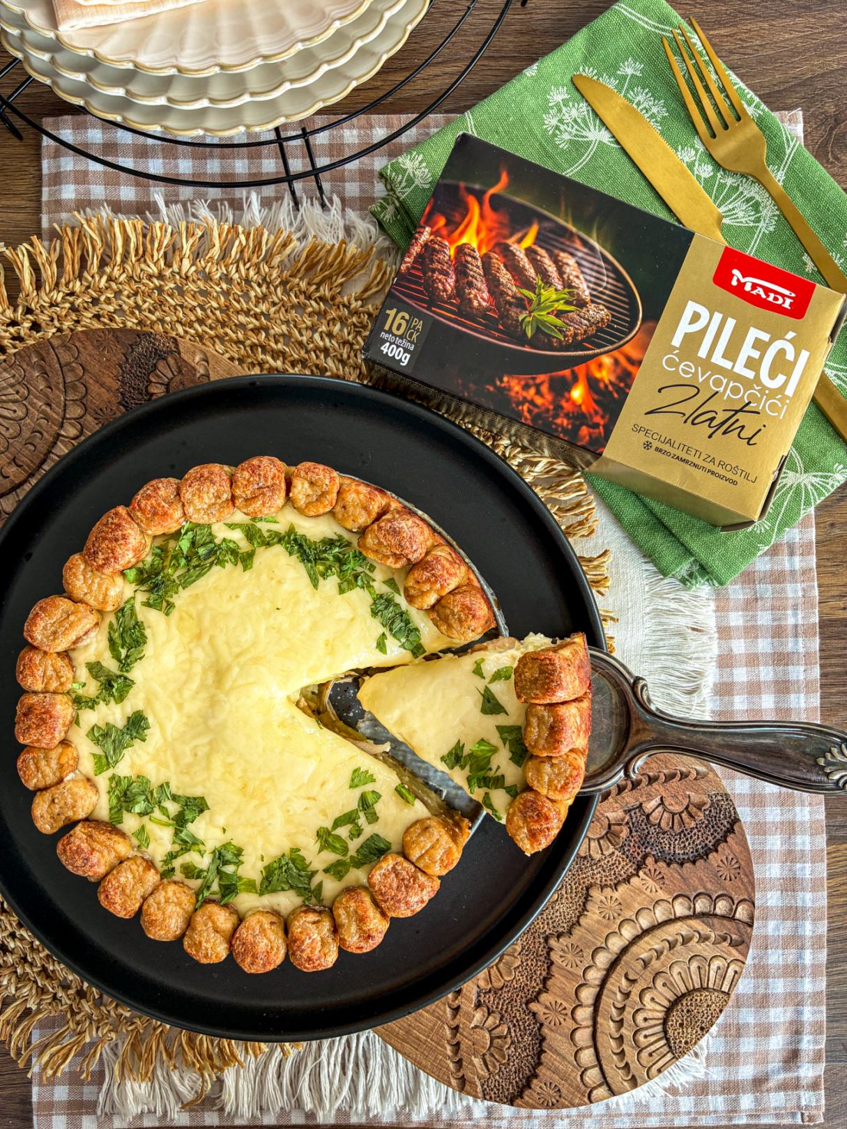 Ponovite postupak sa ostatkom krompira i ćevapa. Sve prelijte pripremljenim prelivom, pokrijte aluminijskom folijom i pecite oko 60 minuta. Skinite foliju, pospite rendani gauda sir i vratite u isključenu rernu nekoliko minuta, dok se sir lijepo ne otopi. Poslužite toplo, posuto svježim peršunom